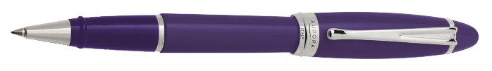 Roller realizado en resina preciosa de alto brillo de color violeta con detalles rodiados. Clip de metal rodiado. Cierre a presión. Recambios disponibles en color azul y negro, punta metálica o fibra, trazos medio o fino.
