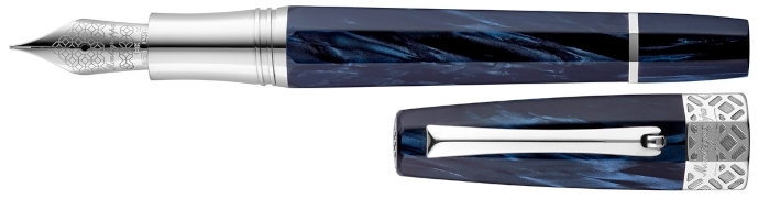 Estilográfica de forma octogonal, cuerpo y capuchón realizados en celuloide de color azul profundo y detalles en plata esterlina 925. Sistema de carga por émbolo integrado y plumin de oro macizo de 18 kt disponible en trazos: EF, F, M, B y ST1. Presentación en estuche especial hecho a mano en madera de nogal e incorpora un frasco de fina tinta italiana. Longitud:137 mm. Diametro:16.6 mm. Peso:42.00 gr